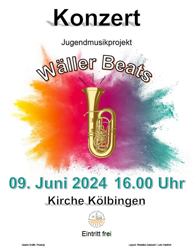 Das Abschlusskonzert findet am 09. Juni 2024 um 16.00 Uhr in der Kirche in Kölbingen statt. Der Eintritt ist frei. Im Anschluss an das Konzert gibt es bei einem Umtrunk im Pfarrheim die Möglichkeit mit den jungen Musikerinnen und Musikern ins Gespräch zu kommen. Zur Finanzierung des Gesamtprojekts freut sich die Gruppe über Spenden auf das Konto der Pfarrei Liebfrauen: Kath. Kirchengemeinde Westerburg, IBAN: DE68 5735 1030 0055 0024 14, Verwendungszweck „Jugendmusikprojekt Wäller Beats“. Spendenquittungen können ausgestellt werden; bei Spendenbeträgen bis zweihundert Euro genügen der Überweisungsbeleg oder ein Kontoauszug zum Nachweis beim Finanzamt.