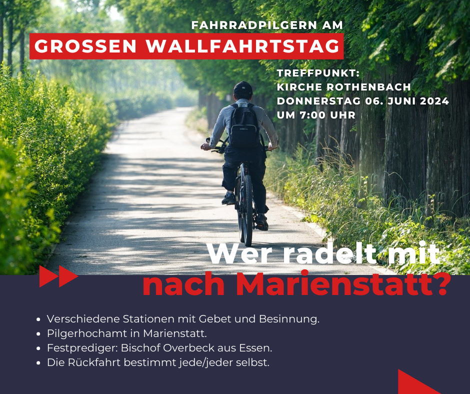 Wer radelt mit, am großen Wallfahrtstag? Donnerstag, 06. Juni 2024, 7.00 Uhr, ab der Kirche in Rothenbach
