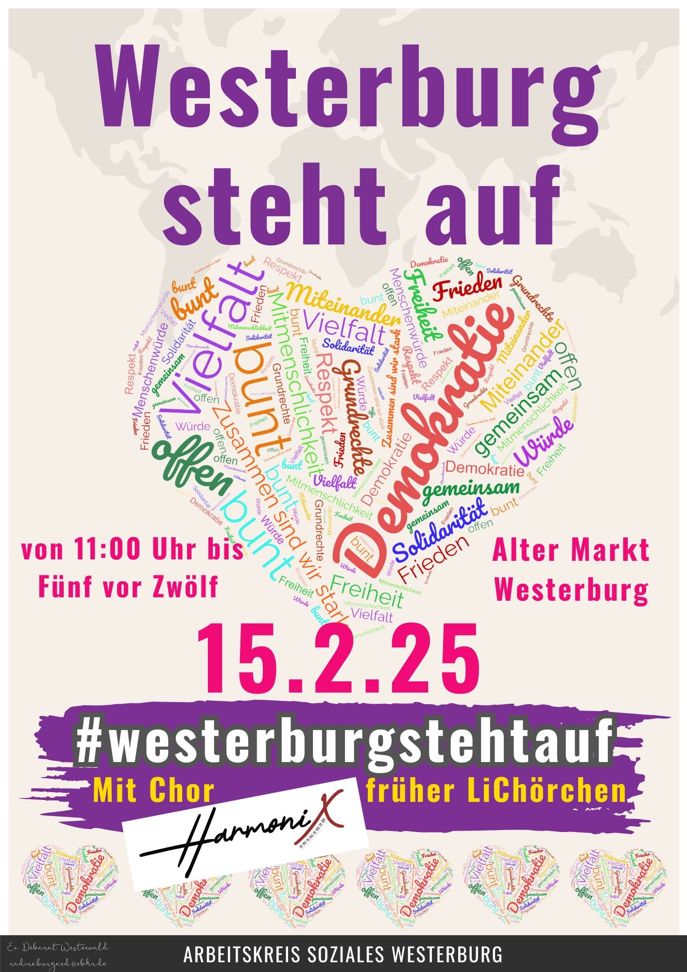 Westerwaldkreis. Der Arbeitskreis Soziales Westerburg ruft für Samstag, 15. Februar, erneut zu einer Kundgebung auf. „Westerburg steht auf“ – das ist auch 2025 der Titel, unter dem Menschen ein starkes Zeichen für Demokratie, Toleranz und Zusammenhalt setzen möchten. Die Kundgebung beginnt um 11 Uhr auf dem Marktplatz und dauert etwa eine Stunde. Musikalisch gestaltet wird sie vom Vokalensemble HarmoniX (früher LiChörchen).